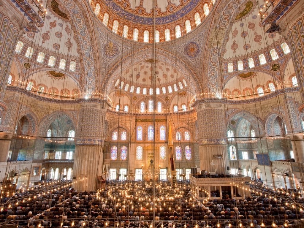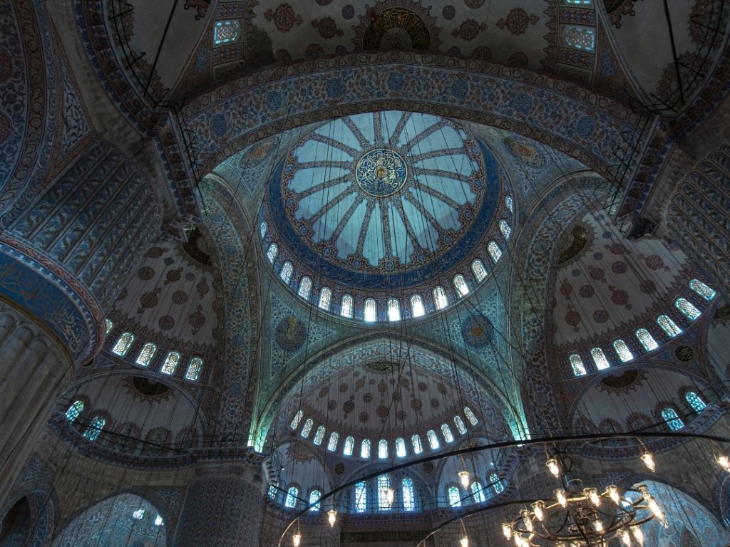 The mosque’s popular name comes from the over 20,000 handmade İznik ceramic tiles that adorn its interior walls. The dominant sapphire and turquoise blues, depicting traditional Ottoman motifs like tulips and cypress trees, create a breathtaking, immersive blue atmosphere, especially when illuminated by the chandeliers.